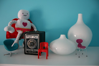 I gave Julie these tiny chairs in her Christmas stocking...they are miniatures of designer chairs (ones that nobody I know would ever be able to afford). Julie loves tiny collectibles and these were too cute to pass up. I doubt this display will always look like this, but I was happy with it long enough for a photo opp!